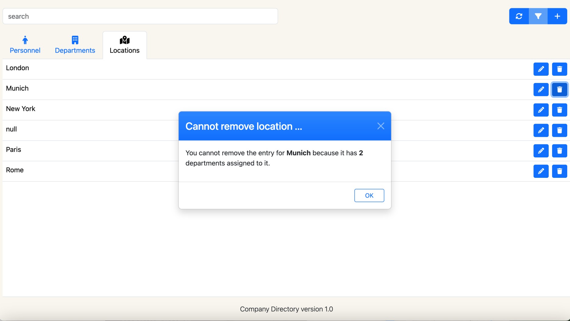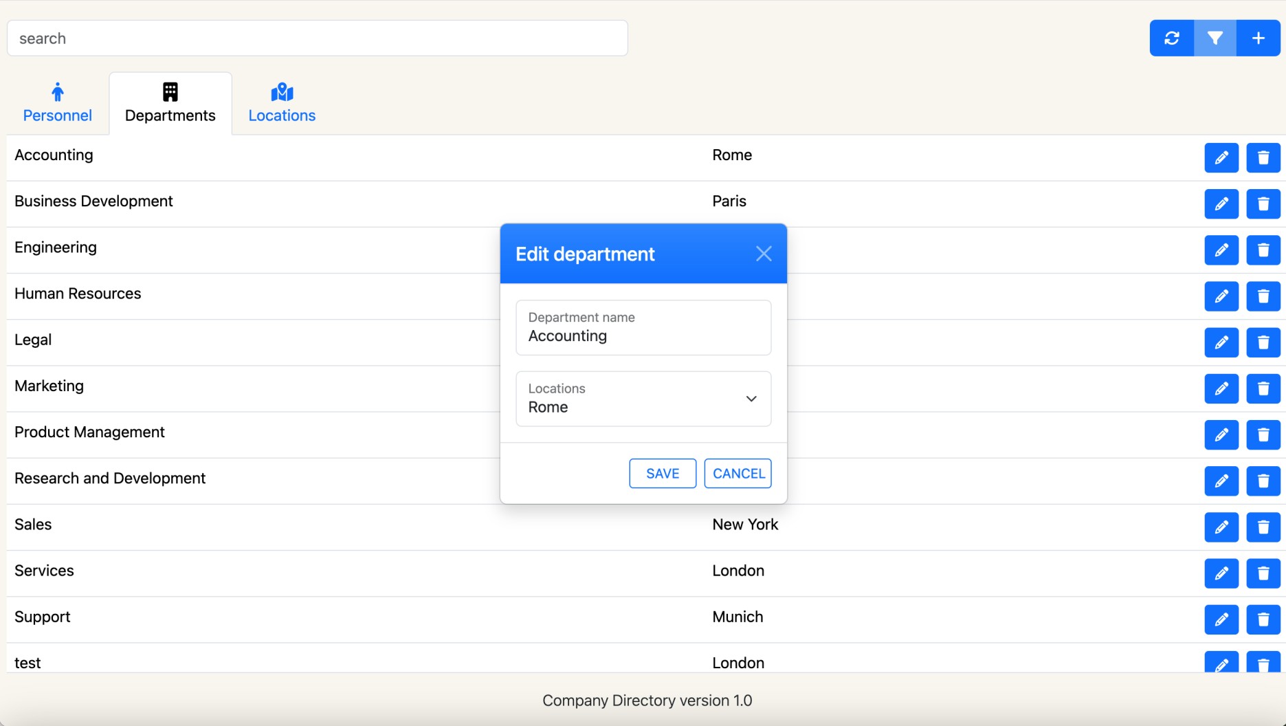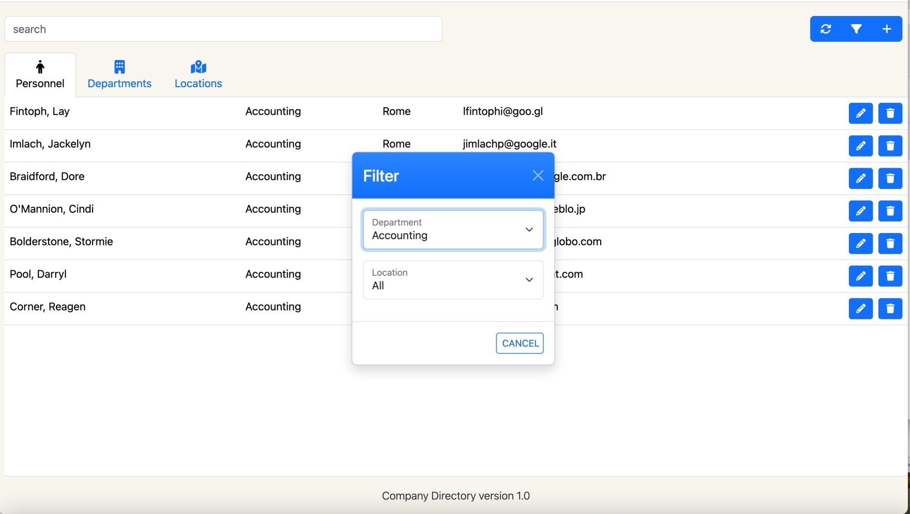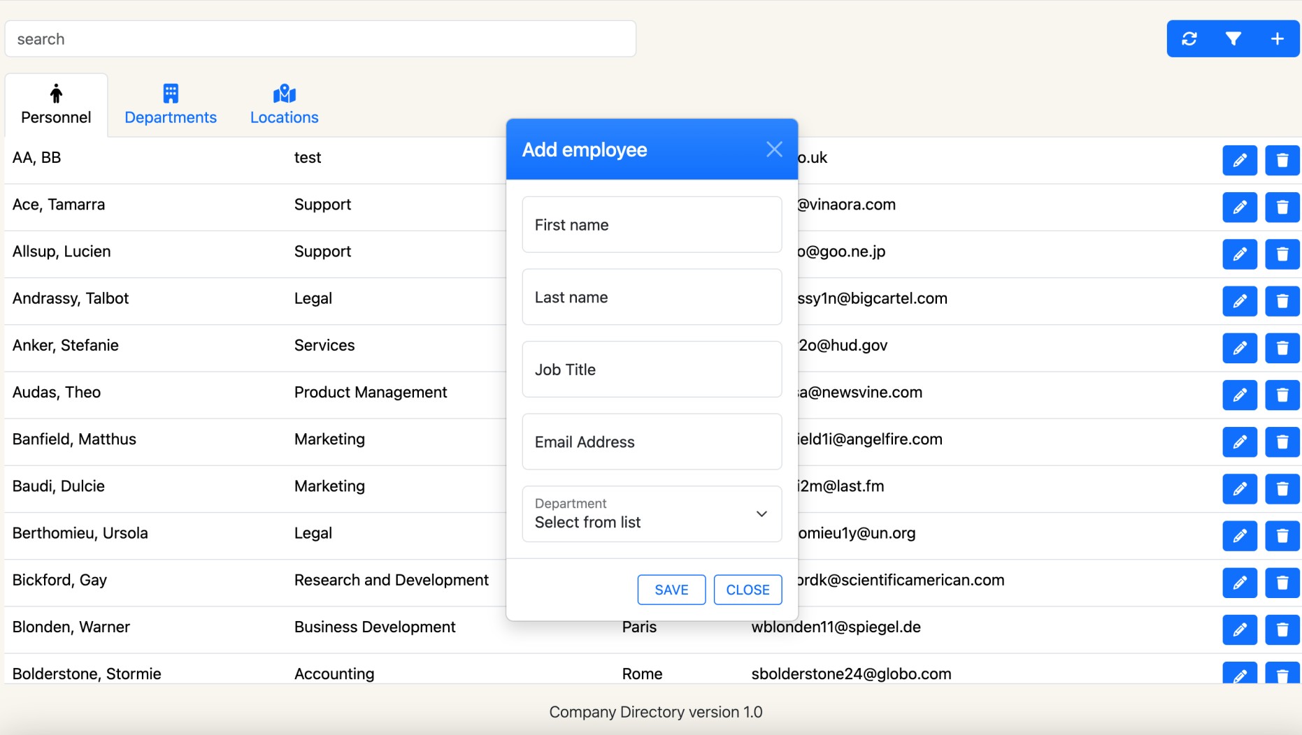 This web application consisted of CRUD functionality (create,read,update and delete). The interface allowed the manipulation of employee information that was held in a database. The directory allowed for searching and filtering employee information by location or department and functionality on adding, editing and deleting employee information. The data was retrieved through backend requests and displayed in the front end for the user.